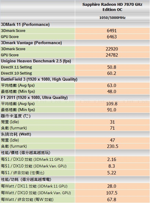 SAPPHIRE Radeon HD 7870 GHz Edition OC 是首批少數超頻版產品,配合雙風扇散熱方案,效能及溫度表現都比略勝公版。性價比方面,售價 $2,990 計算出「每$1/綜合效能」為 5.22,得分屬高階顯示卡普遍水平,但考慮到性能已比 Radeon HD 7950 略高,而且先前評測已知尚有空間進一步超頻,唔洗$3,000 來說絕對係高階玩家理想選擇。