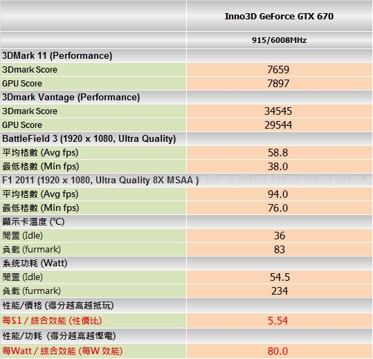 Inno3D GeForce GTX 670 作為 NVIDIA 新型號產品,賣點是公版設計,用料方面較有保證。性價比方面,Inno3D GeForce GTX 670 錄得 5.54分,相比硬件專題計算的 5.5 平均分略高,加上 Inno3D 正舉行優惠換購 Cooler Master Gaming 滑鼠,要是買卡打機的話就更吸引。