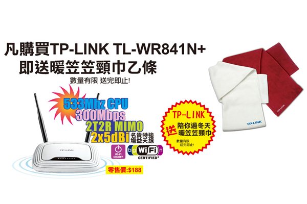 TP-LINK,承蒙各用家支持,銷量屢創佳績。TP-LINK為慶祝元旦,回饋用家,現凡購買TP-LINK TL-WR841N+ 無線路由器,即送TP-LINK陪你過冬天暖笠笠頸巾乙條,讓您有一個暖笠笠的冬季。數量有限,勿失良機!