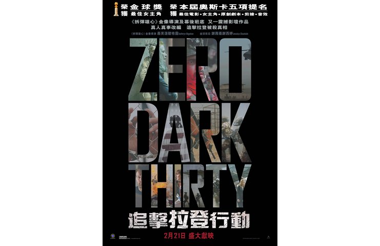 《追擊拉登行動》(Zero Dark Thirty)榮獲本年度奧斯卡五項提名,由憑金像電影《拆彈雄心》(The Hurt Locker)成為「史上首位奧斯卡金像女導演」的嘉芙蓮碧格露(Kathryn Bigelow)掌舵,率領金像編劇馬克寶爾(Mark Boal)等原班人馬、新鮮出爐金球影后及奧斯卡影后提名謝茜嘉謝西婷(Jessica Chastain)、《奪命無聲》占士簡東費尼(James Gandolfini)、《神探福爾摩斯》馬克史壯(Mark Strong)、《無法無天》積臣卡格(Jason Clarke)等實力演員陣容。劇組花了六年時間穿梭美國、阿富汗、巴基斯坦多地,搜索第一手準確資料,將2001年「911」事件後,美國中央情報局(CIA)及美軍苦苦追撃拉登(Osama bin Laden)十年,最後在2011年5月戲劇性將拉登擊斃的背後歷史真相,足本呈現於大銀幕!
