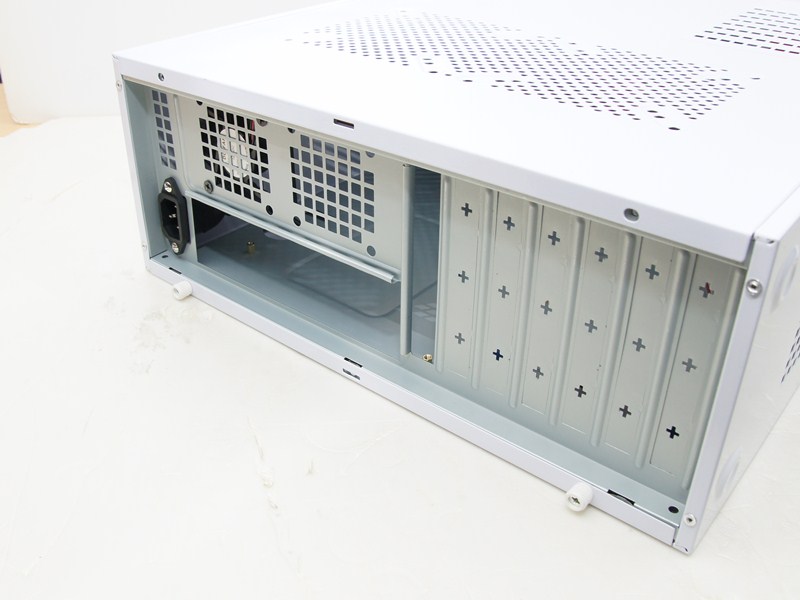雖然308以節省空間為大前提,但機箱則仍然採用Full Profile設計來加強PCI槽的擴充能力,若果用家會在日後升級顯示卡或是擴充卡就更為方便。為了解決前置火牛的散熱問題,機箱底部就特地加入透氣孔,而背板上更擁有兩組6CM風扇槽,加上機箱側板提供了兩個支援8CM或12CM的透氣孔,就算有安裝顯示卡也能勝任散熱問題