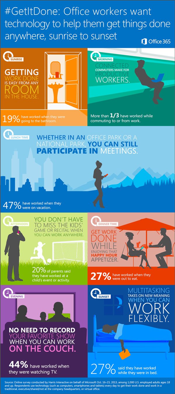 身處現今繁忙的商業世界,無論於辦公室、機場、健身室或任何地方,於辦公室以外的環境完成工作的需求越來越龐大。根據最近一項由Microsoft Corp委託Harris Interactive對1,000名美國員工進行的網上研究顯示,隨著生活與工作漸趨融合,超過一半(56%)白領上班族表示僱主期望他們不論身處何地都能完成工作;逾三分一(37%)受訪人士指出他們於辦公室以外的環境能得到最好的構思;近半表示他們曾經於放假時工作,十名中有七名員工(70%)受訪者指望能在辦公室以外,例如機場、火車、咖啡店、公園等的地方工作。