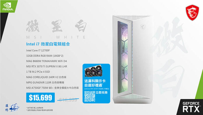 而家至到4月30日,MSI 微白主機優惠由 $18,999 減至 $15,699,減足 $3,300。主機以銀白色作為主題,採用 MSI MPG GUNGNIR 110R 白色機箱、MSI A750GF 750W 80+ 金牌全模組火牛白色版、MAG CORELIQUID 240R V2 白色水冷搭配銀色 MAG B660M TOMAHAWK WiFi D4 主機板。而性能上,使用最新 12 代 i7 12700F 處理器,配合系列頂級 MSI RTX 3070 Ti SUPRIM X 8G LHR 顯示卡,多工和遊戲心性能兼備。