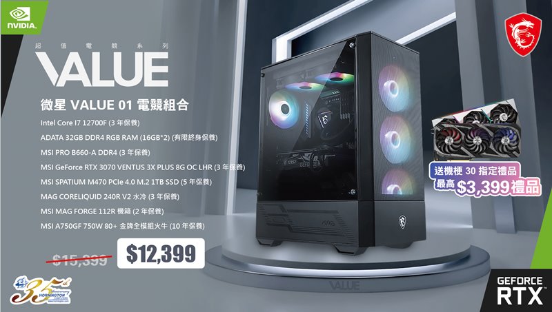 配置 GeForce RTX 30 系列顯示卡,不僅可獲得效能提升,更可獲得豐富禮品。現凡於漢科網店購買主機即由原價 $15,399 減至 $12,399,同時因內附 GeForce RTX 3070 顯示卡,即可兌換「機梗30」優惠,自選禮品 XPG S50 1TB PCIe 4.0 SSD 或 ENERMAX REVOLUTION D.F 850W 金牌全模組火牛 (總數限量 40 份)。優惠期至 2022 年 7 月 31 日。在購買時備注即可,無需額外提交換兌申請 !